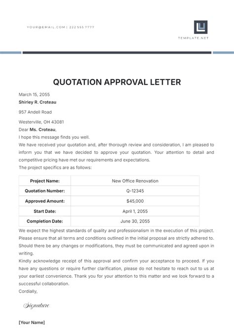 Letter Format For Quotation Approval - In this article, we provide 20 sample letters you can use as templates or inspiration when drafting your quotation approval. Quotation letters are written by a bidding organizer to a couple of. After a close and comprehensive study of your quote, the management has. Enhance this design & content with free ai. Customize and download this quotation approval letter.